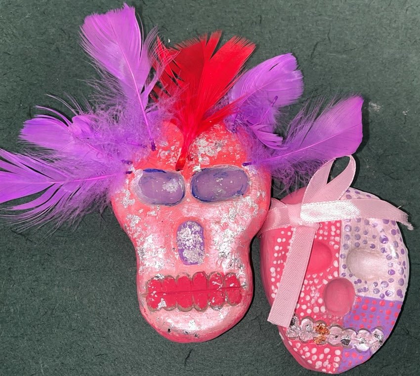 Year 8 students took their creativity to new heights by crafting 3D clay models for their Day of the Dead sculptures. They studied facial proportions and mapped out facial structures for their designs, which they then enhanced with acrylic paints and additional materials to add unique features.